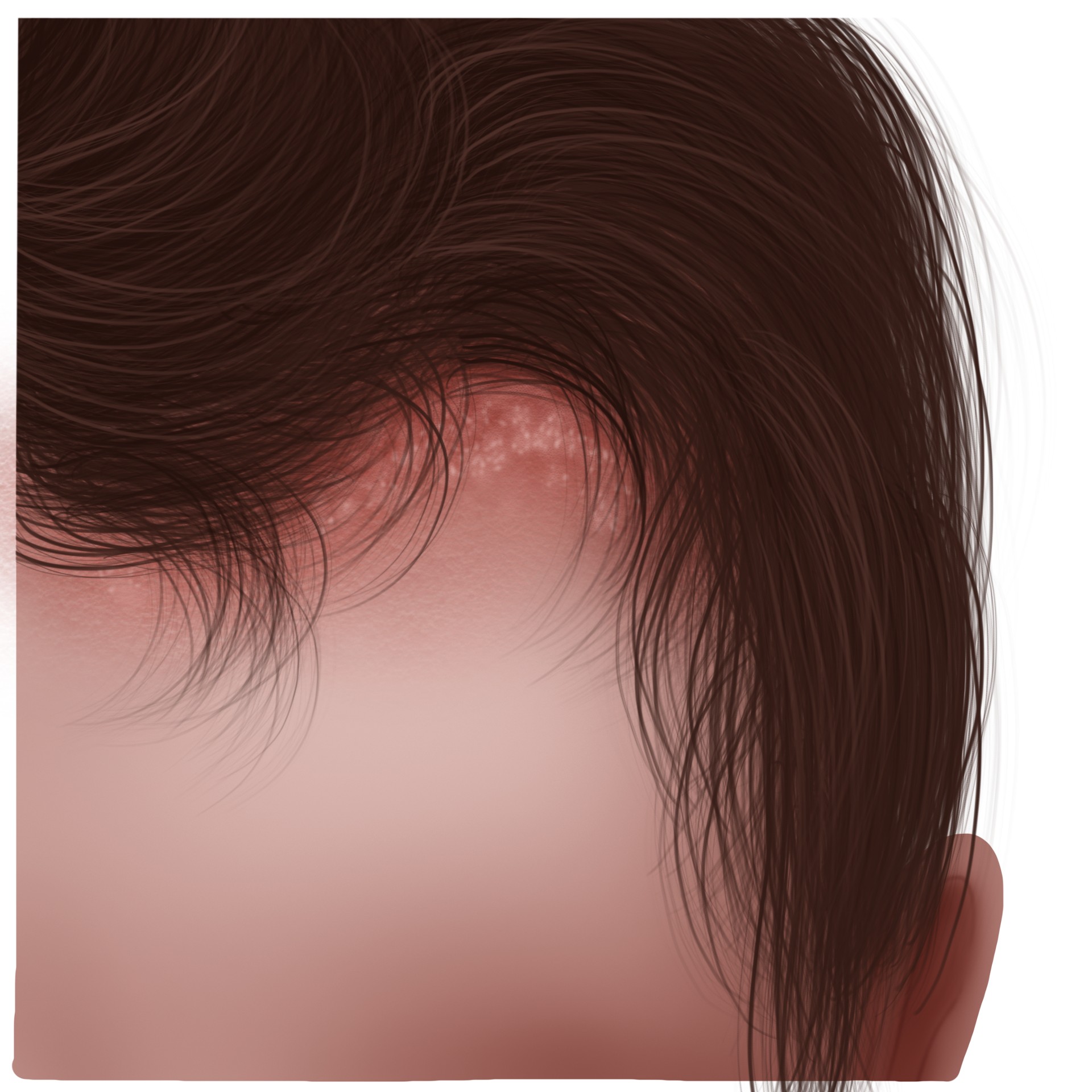 It manifests with reddened skin with scabs and/or white to yellowish flaking. It mainly affects skin's oily areas such as the scalp, the face or the inside of the ears.